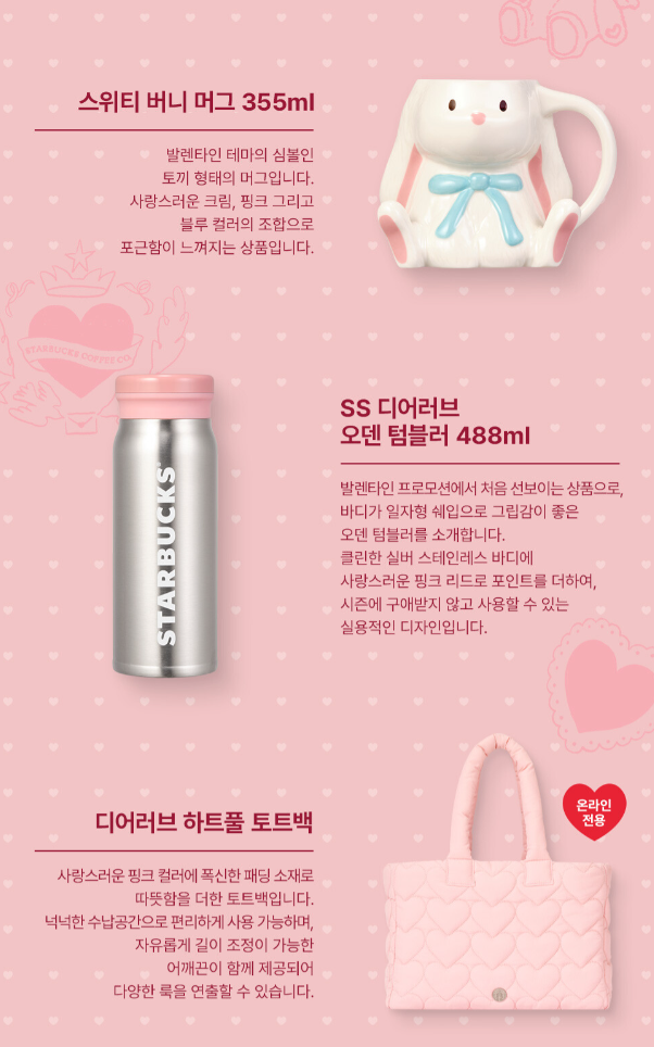 핑크빛으로 가득한 스타벅스 발렌타인 MD! 사랑스러운 디자인에 심장이 콩닥콩닥 뛰지 않나요?!🥰 특히 올해는 17종이나 되는 다양한 제품들이 출시되어 선택의 폭도 넓어졌어요! 뭘 사야 할지 행복한 고민에 빠지게 만드는 스타벅스! 지금 바로 자세히 살펴볼까요?
